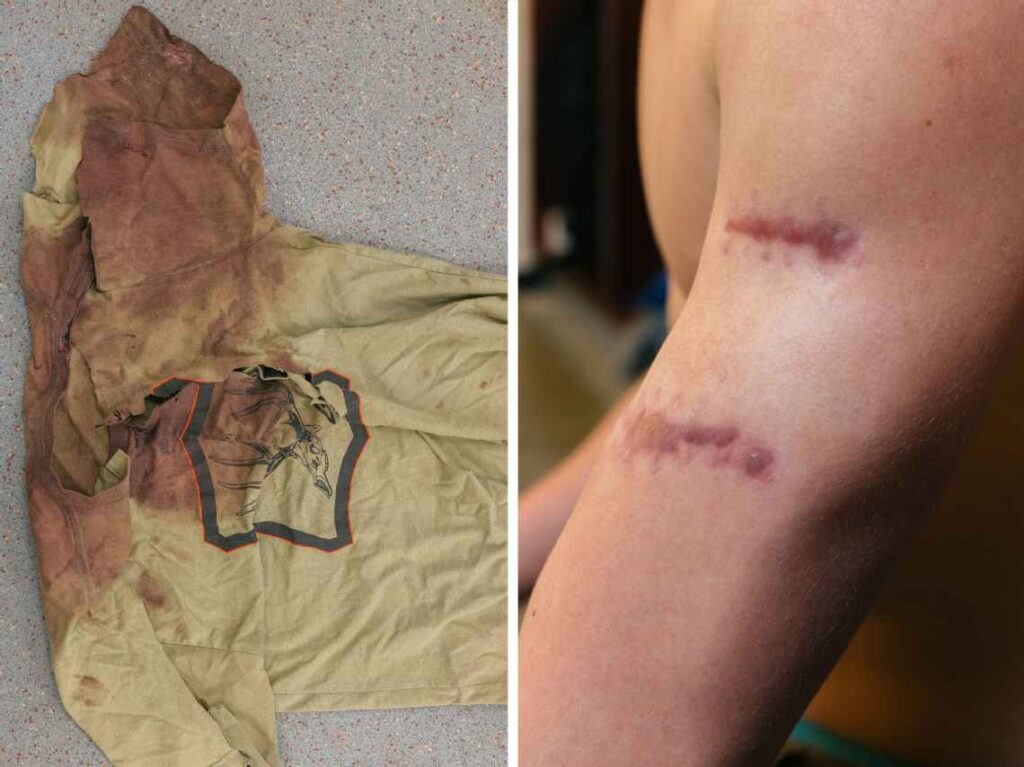 She struck him again. Bit into his skull, his cheek, his shoulders. At one point, she lifted his entire body off the ground by his head. Kendell had nothing left. His bicep on one arm had been torn from the bone. Puncture wounds covered his legs and torso. He lay still and waited to die.